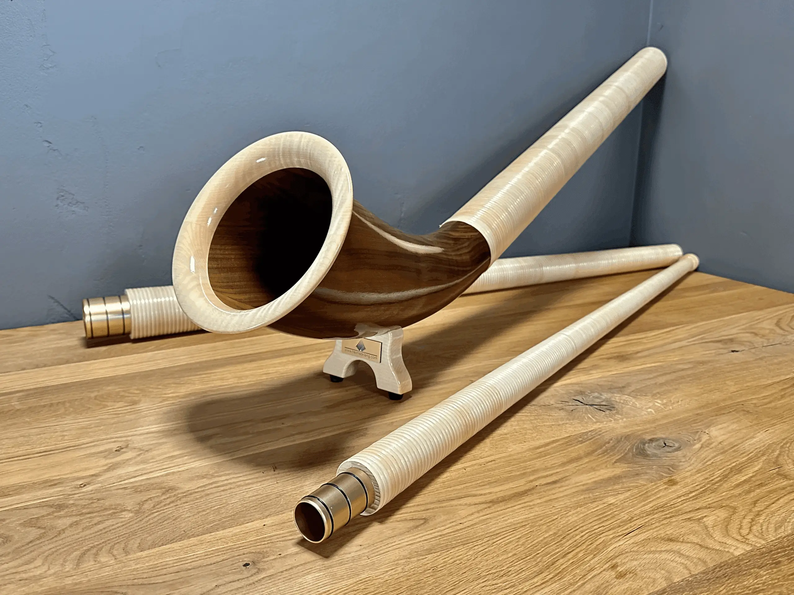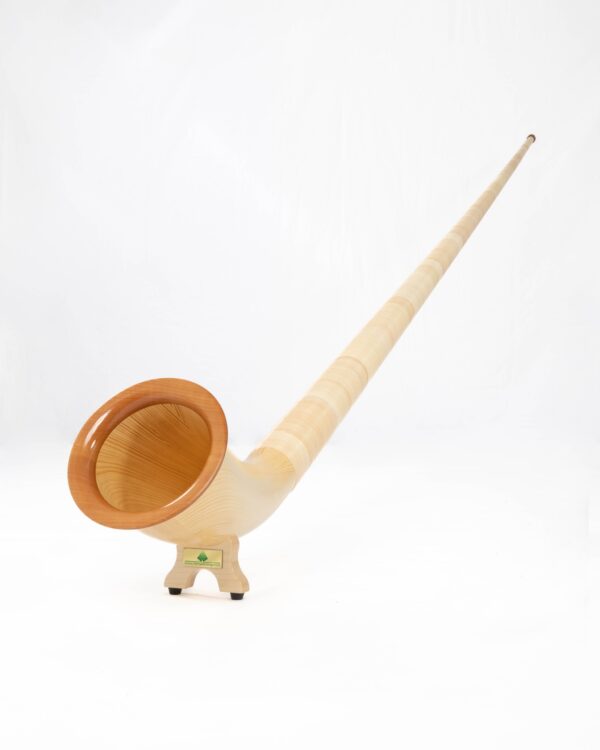 Le cor des Alpes en épicéa est le cor des Alpes le plus joué au monde. En Europe, en Amérique et en Asie, l’accordage fa dièse/sol dièse est principalement utilisé ; en Suisse, c’est l’accordage fa dièse/sol dièse le plus courant. Caractéristiques : le cor des Alpes en épicéa trois pièces, accordé fa dièse/sol dièse, se compose d’un tube à main, d’un tube central et d’un tube de pavillon. Le fond du pavillon est en érable (bois dur)