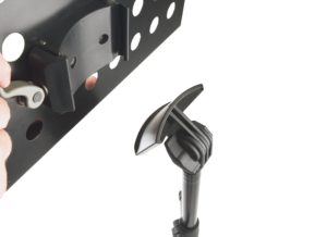 Le pupitre 11940 de K&M est un pupitre recouvert de peinture en poudre perforé en métal avec jointures caoutchouc. La tête du pupitre se fixe avec une attache rapide et pratique pour le montage et démontage. Des vis à ailerons facilite le positionnement incliné du pupitre. La hauteur se règle sans cran, idéal pour avoir les notes à la hauteur désirée, une douille de serrage protège le manche du pupitre lors des utilisations.